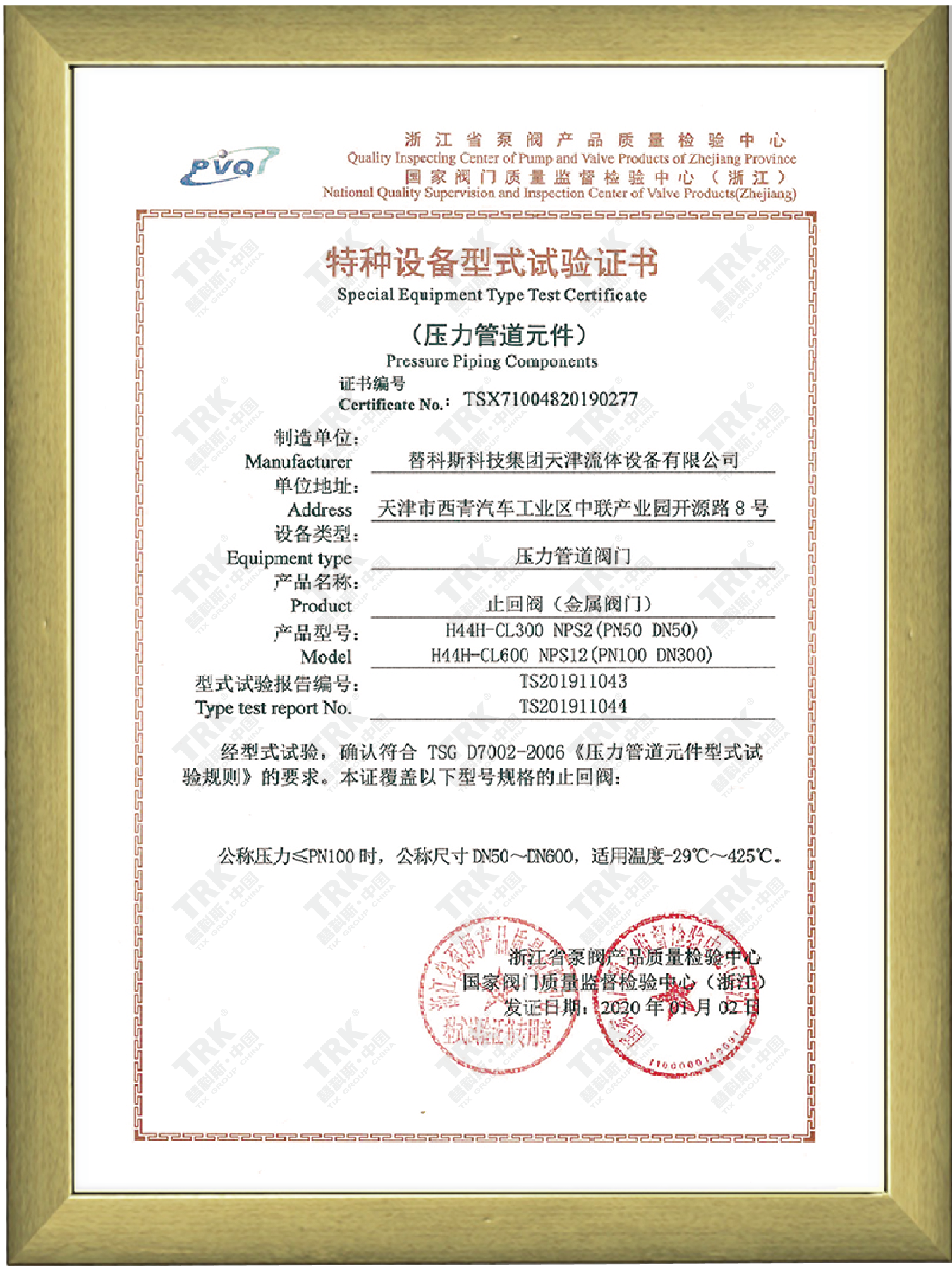 特種設備型式試驗證書-止回閥