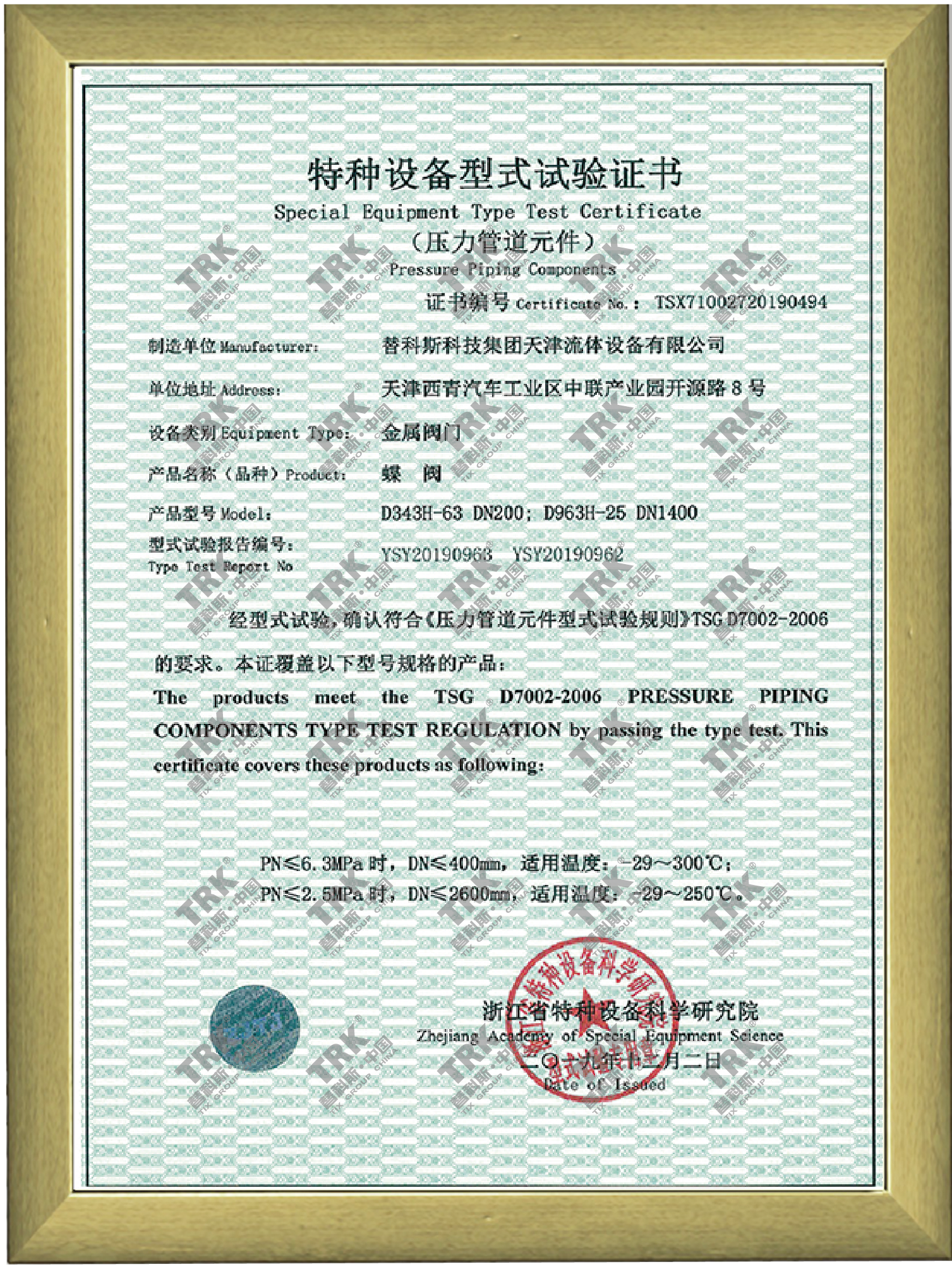 特種設備型式試驗證書-蝶閥